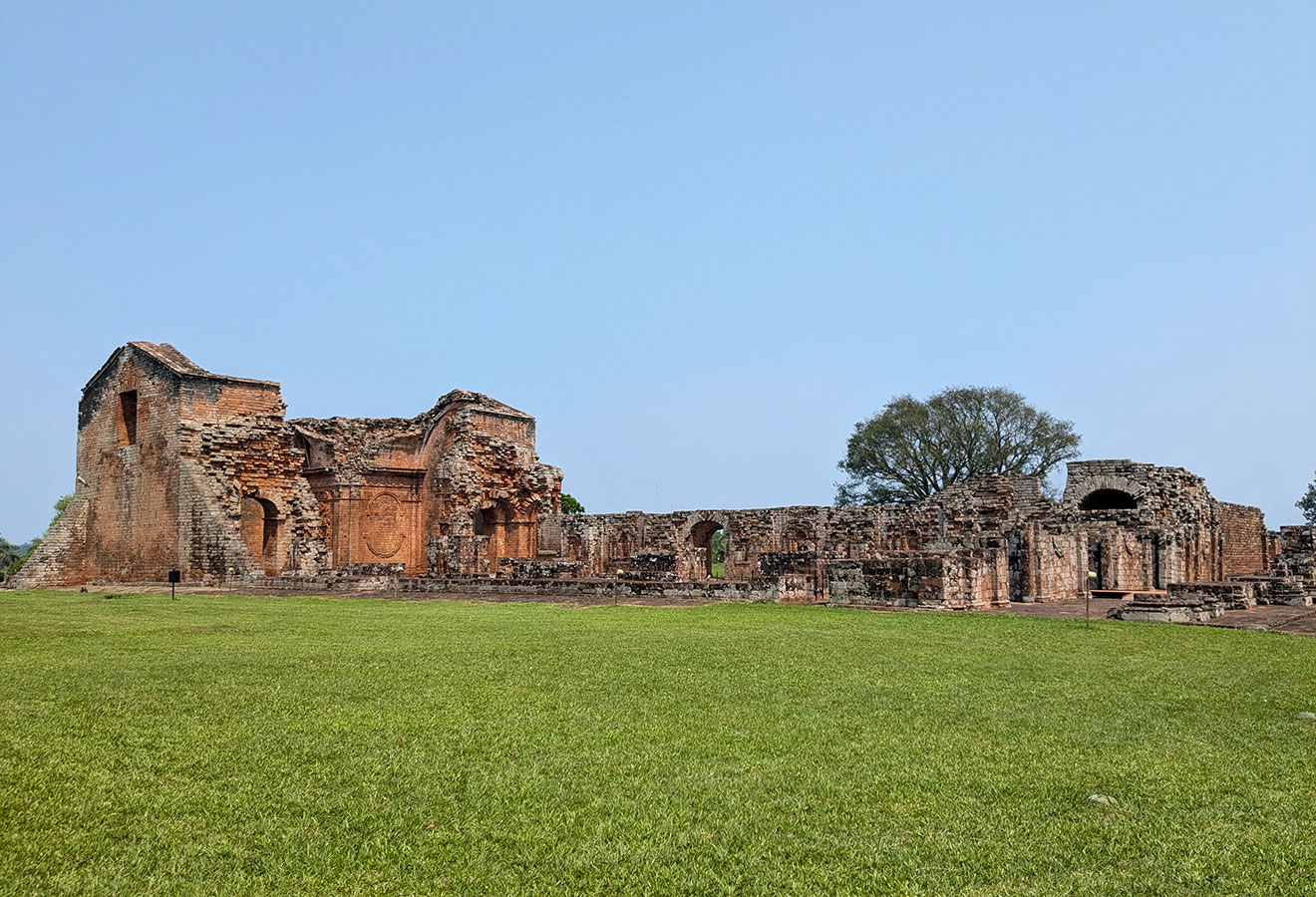 Ruins of a large stone building with red brick walls and arches stand on a grassy area under a clear blue sky. Some walls are partially collapsed, and trees are visible in the background—an ideal location for those interested in exploring Paraguay's history.